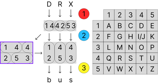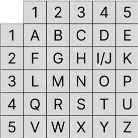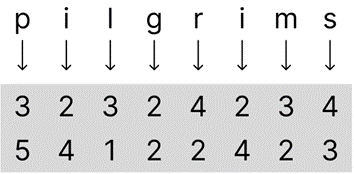 As we can see from the grid, the position of the letter ‘p’ is ‘3 5’, ‘i’ is ‘2 4’, ‘l’ is ‘3 1’, etc. The conversion from the plaintext “pilgrims” into numbers can be written out as two rows and N columns (N is number of letters in the plaintext), such that the ‘row’ number of each letter is written in the top row and the ‘columns’ number of each letter is written in the bottom row. The plaintext “pilgrims” appears like this: