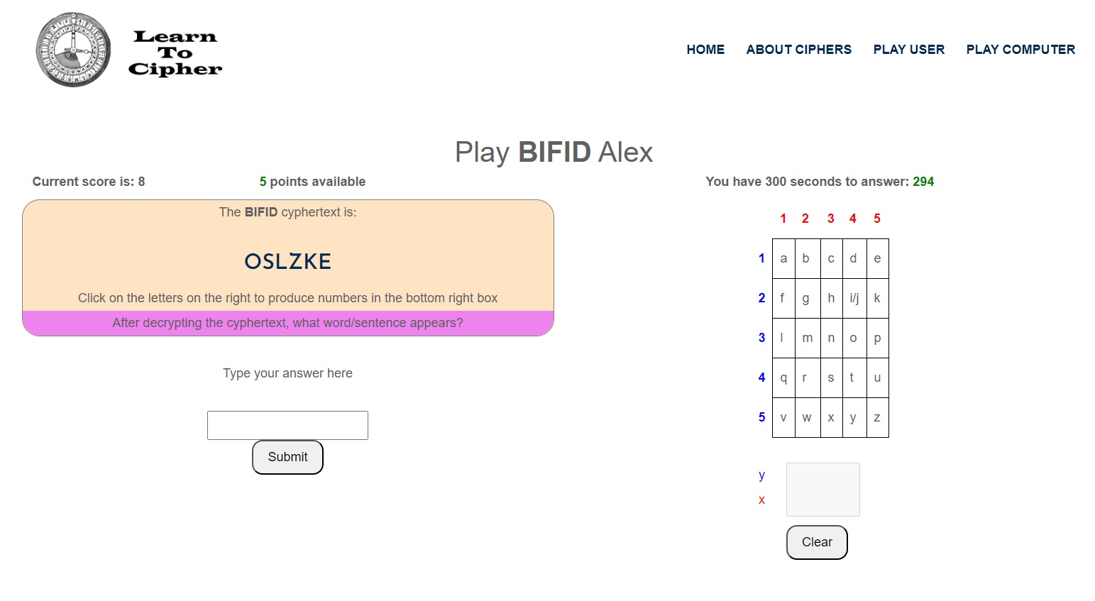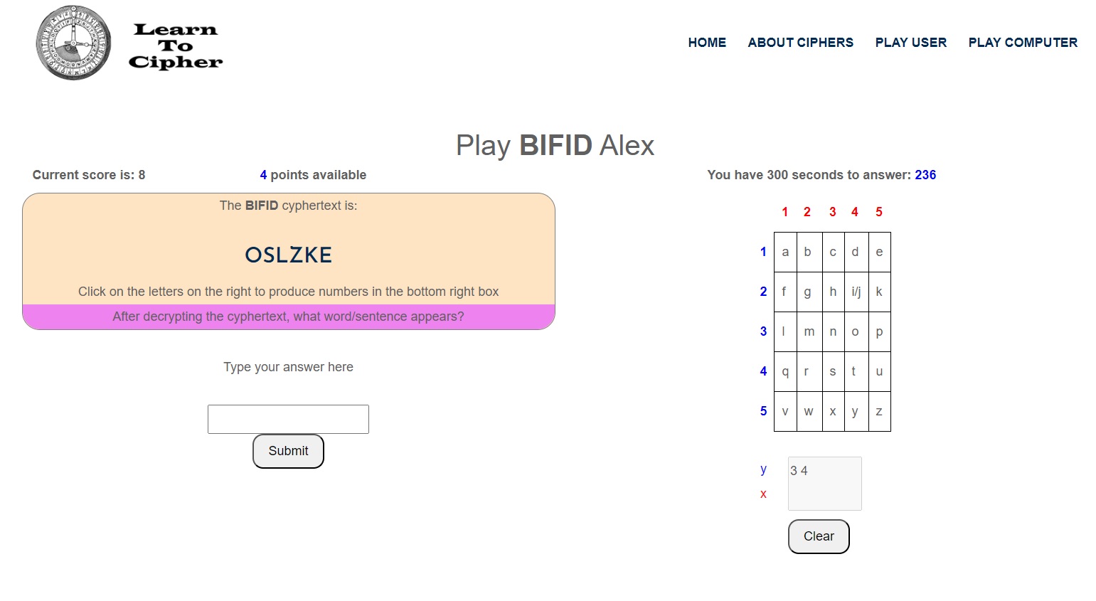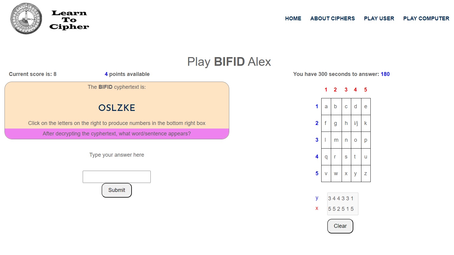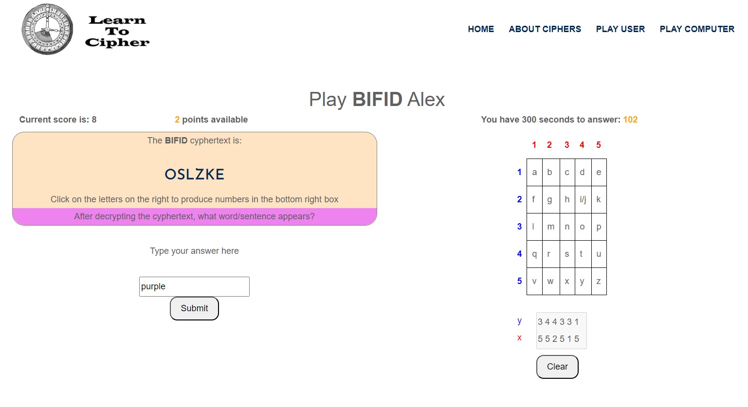 Once the 2xN grey box is full, the user then reads the ‘vertically’ paired numbers and types in the plaintext into the answer box, which in the example the plaintext is "purple".