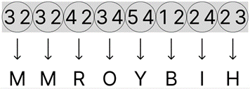 The first step (in red) is to convert the letters in the cyphertext “MMROYBIH” into ('horizontally') paired numbers. The second step (in blue) is to change the grey box from 1xN to 2xN, showing the switch from ‘horizontally’ paired numbers to ‘vertically’ paired numbers. The third and last step (in yellow) is to convert the paired numbers into letters, giving the plaintext “pilgrims”.